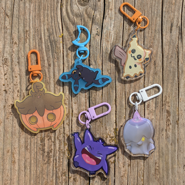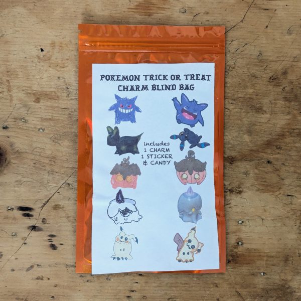 Trick or Treat! Which will you get? Each blind bag contains an acrylic charm that could be either a trick – a deliberately jankily drawn design – or a treat – a deliberately beautifully drawn design! Every bag also contains a sticker, and some Halloween candy.